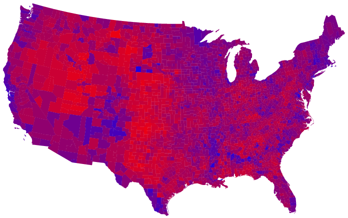 But we can go further. We can do the same thing also with the county-level election results and the images are even more striking. Here is a map of US counties, again colored red and blue to indicate Republican and Democratic majorities respectively: